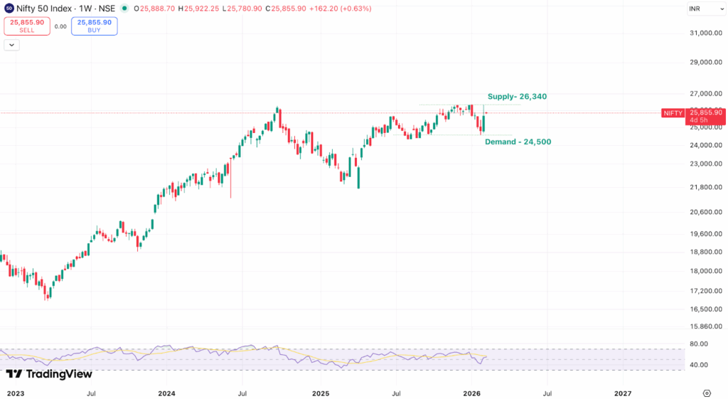 The Nifty50 Index gained by 3.5% and closed at 25,693 in the last week. An immediate support is expected around 24,500 and resistance is expected around 26,340 levels. Nifty is expected to bounce back this week