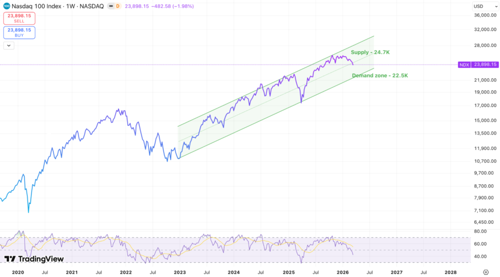 The NASDAQ Index corrected by 2% and closed at 23,900 in the last week. The critical support is expected at 22,500 levels and next resistance is expected around 24,700 levels.