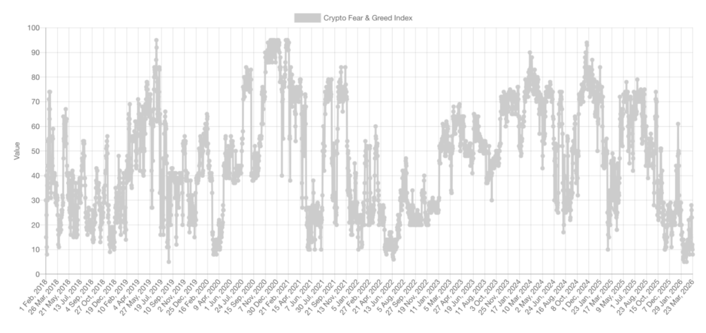 The sentiment towards the cryptocurrency market remained in the Extreme FEAR zone. Compared to last week, the Fear & Greed Index decreased from 23 to “8”. Historically whenever the index had gone below 15, the sentiment has reversed
