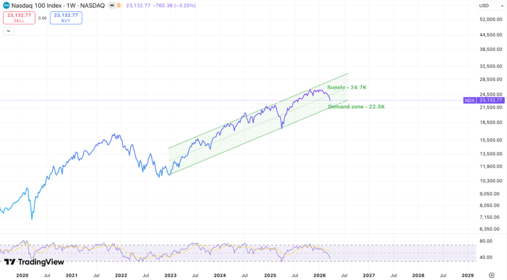 The NASDAQ Index gained by 4% and closed at 24,045 in the last week. The critical support is expected at 22,500 levels and next resistance is expected around 24,700 levels.