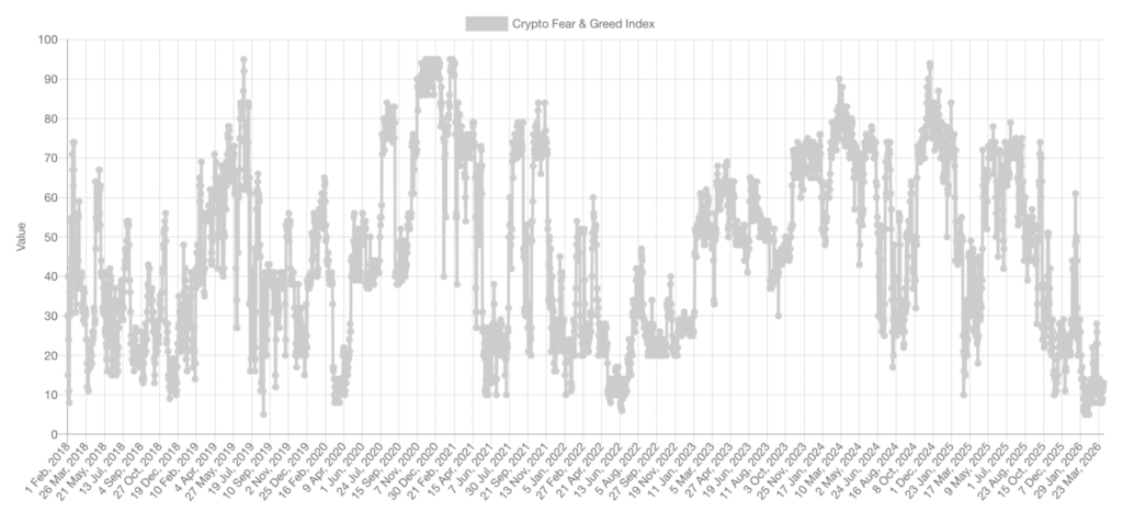 The sentiment towards the cryptocurrency market remained in the Extreme FEAR zone. Compared to last week, the Fear & Greed Index increased from 8 to “13”. Historically whenever the index had gone below 15, the sentiment has reversed